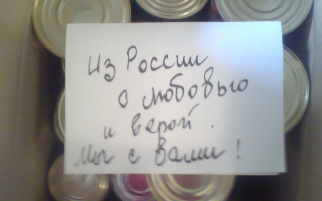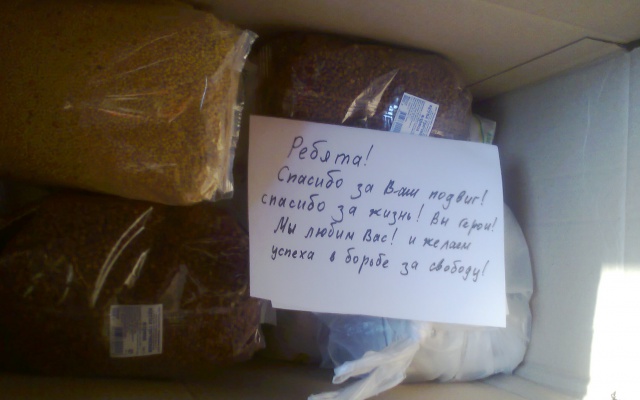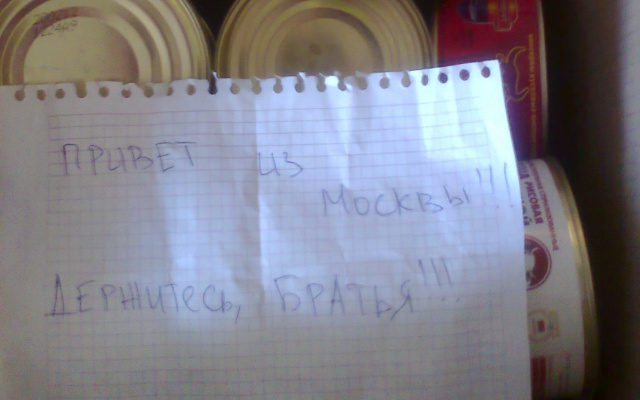 Люди приносят на пункт сбора вещи, продукты питания, лекарства и другие средства. Многие жертвователи кладут в коробки с вещами письма, в которых передают жителям Донецкой республики слова поддержки. На сегодняшний момент собрано около десяти кубов гуманитарного груза.